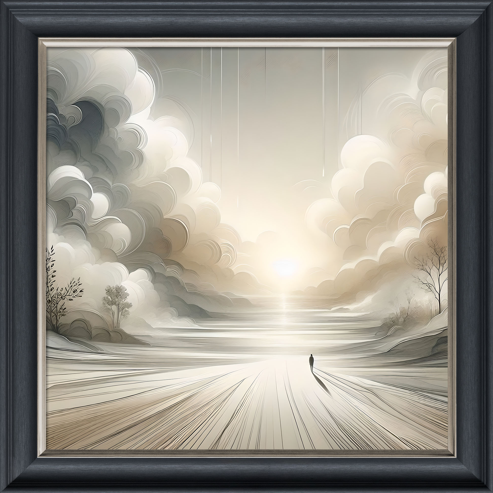 Velvet Illusion Artwork of the Day Breaks picture in an 85 x 85cm or 55 x 55cm dark wood frame effect velvet print.
