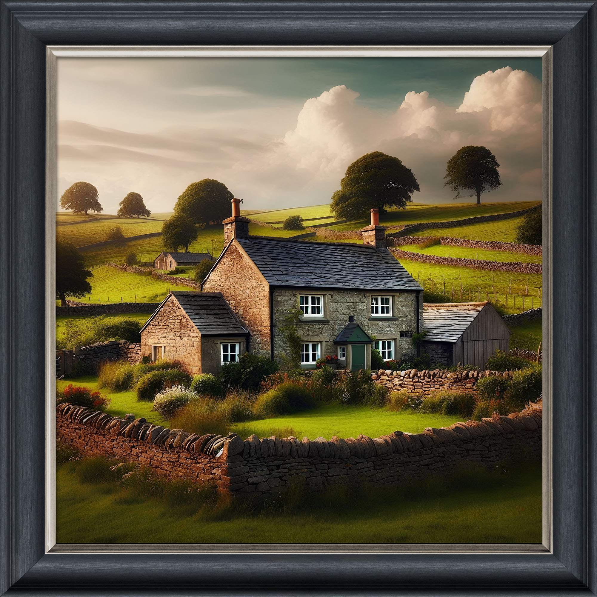 Velvet Illusion Artwork of the Idyllic Cottage picture in an 85 x 85cm or 55 x 55cm dark wood frame effect velvet print.