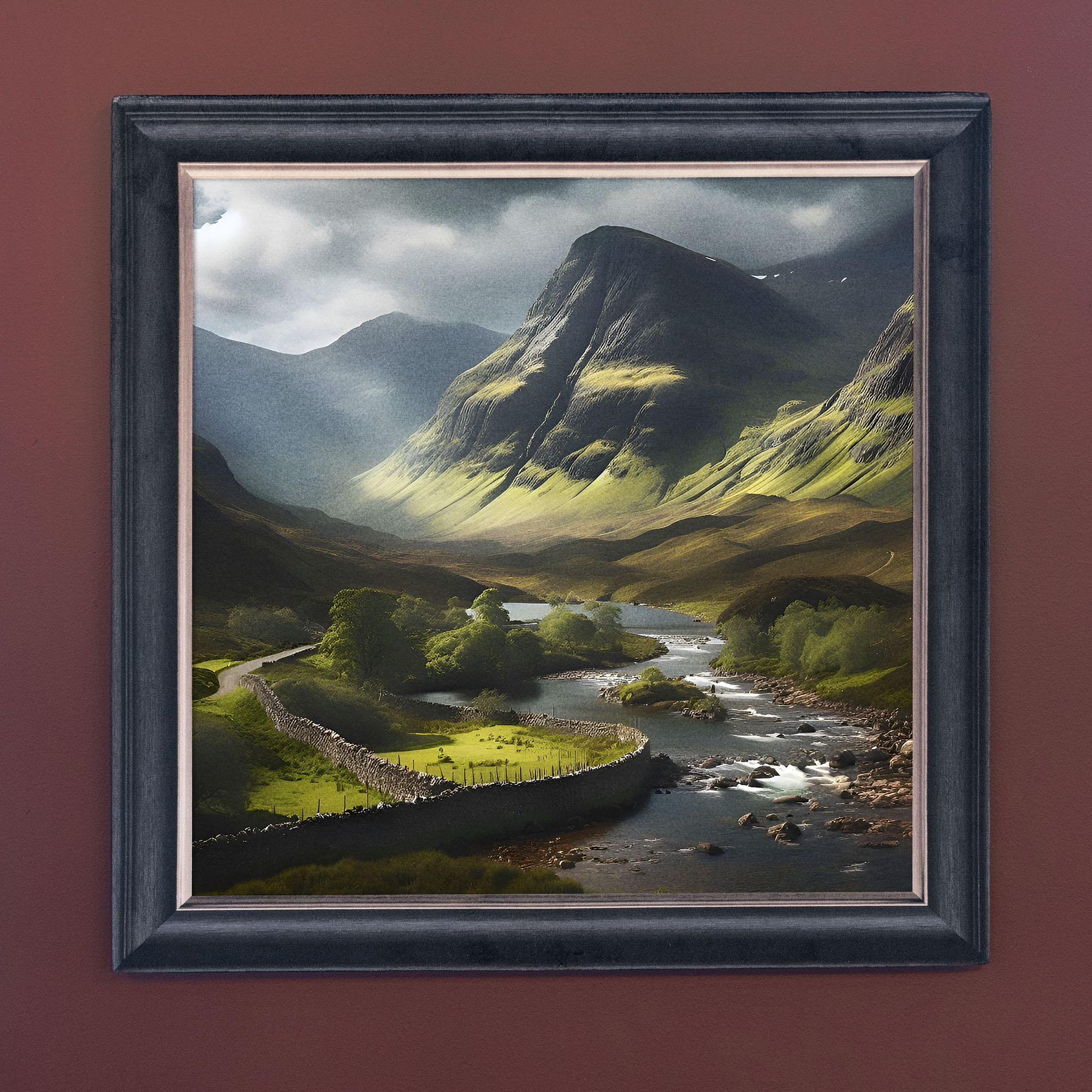 Velvet Illusion Artwork of the Valley picture in an 85 x 85cm or 55 x 55cm dark wood frame effect velvet print.