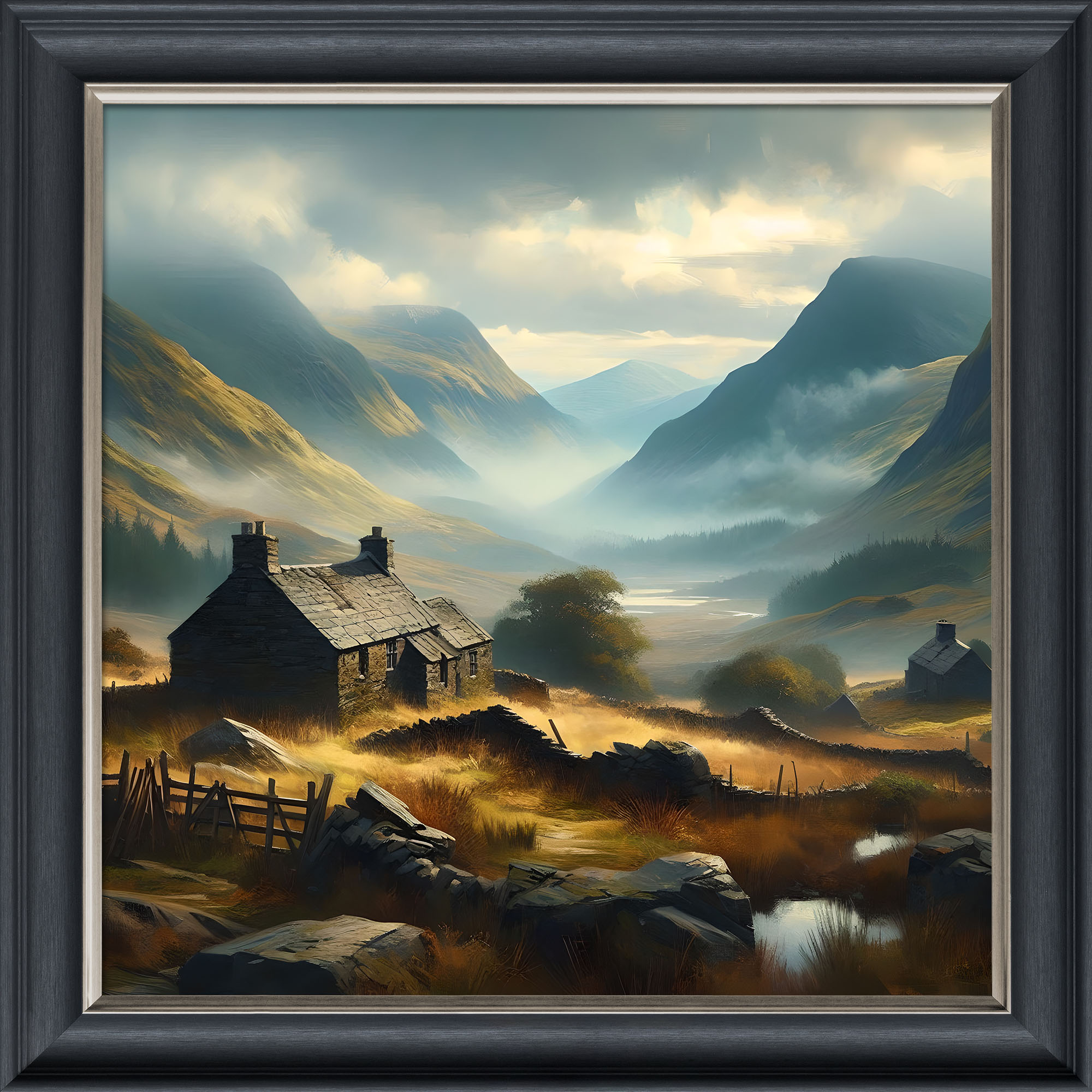 Velvet Illusion Artwork of the Welsh Farmstead picture in an 85 x 85cm or 55 x 55cm dark wood frame effect velvet print.