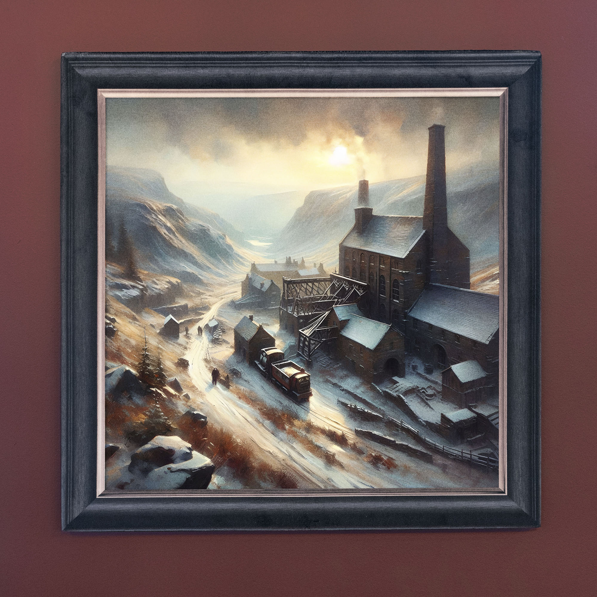 Velvet Illusion Artwork of the Winter at the Mine picture in an 85 x 85cm or 55 x 55cm dark wood frame effect velvet print.