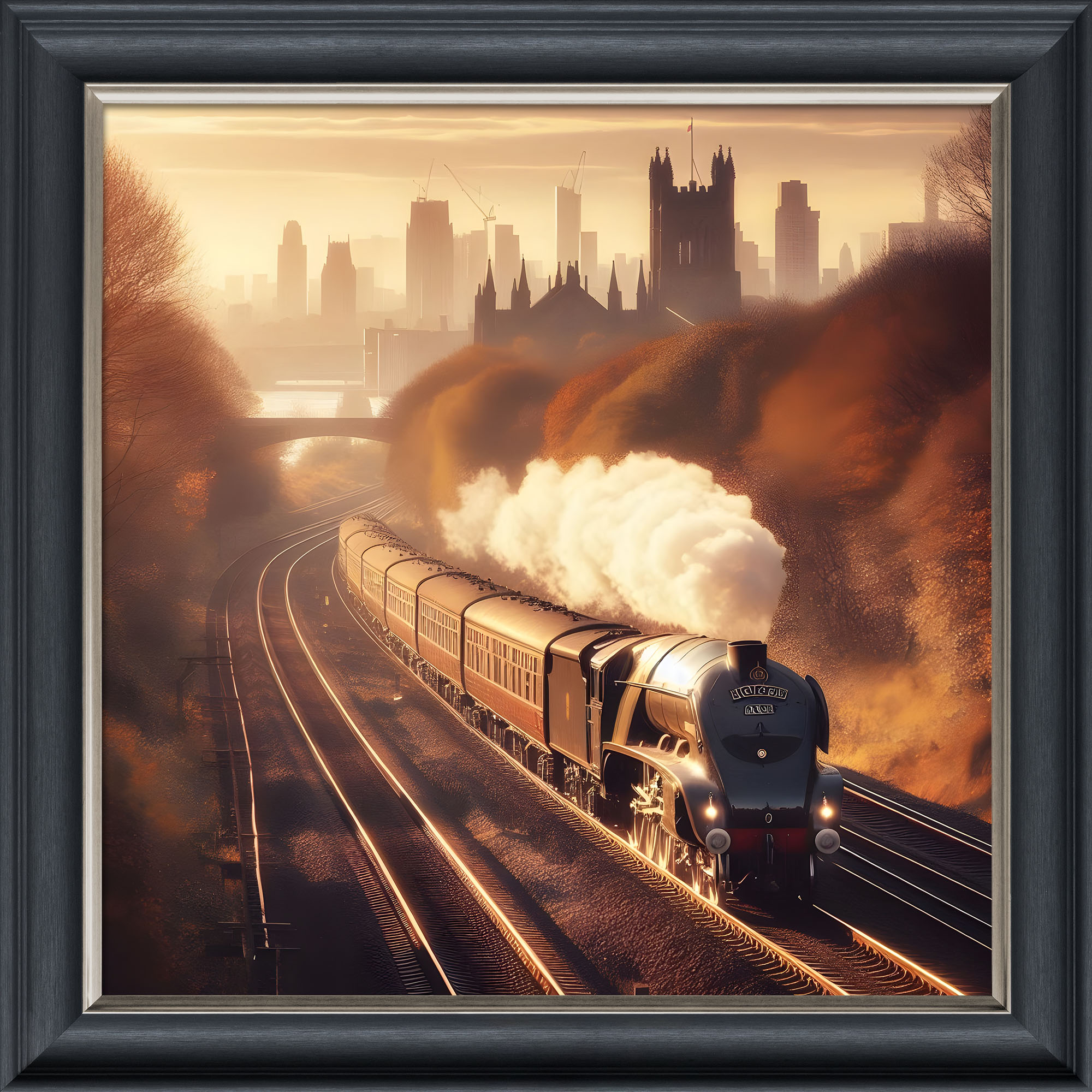 Velvet Illusion Artwork of the Golden Age of Steam picture in an 85 x 85cm or 55 x 55cm dark wood frame effect velvet print.