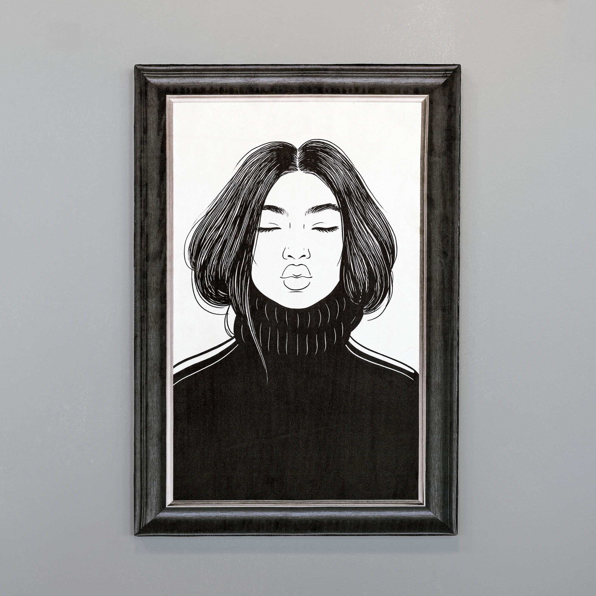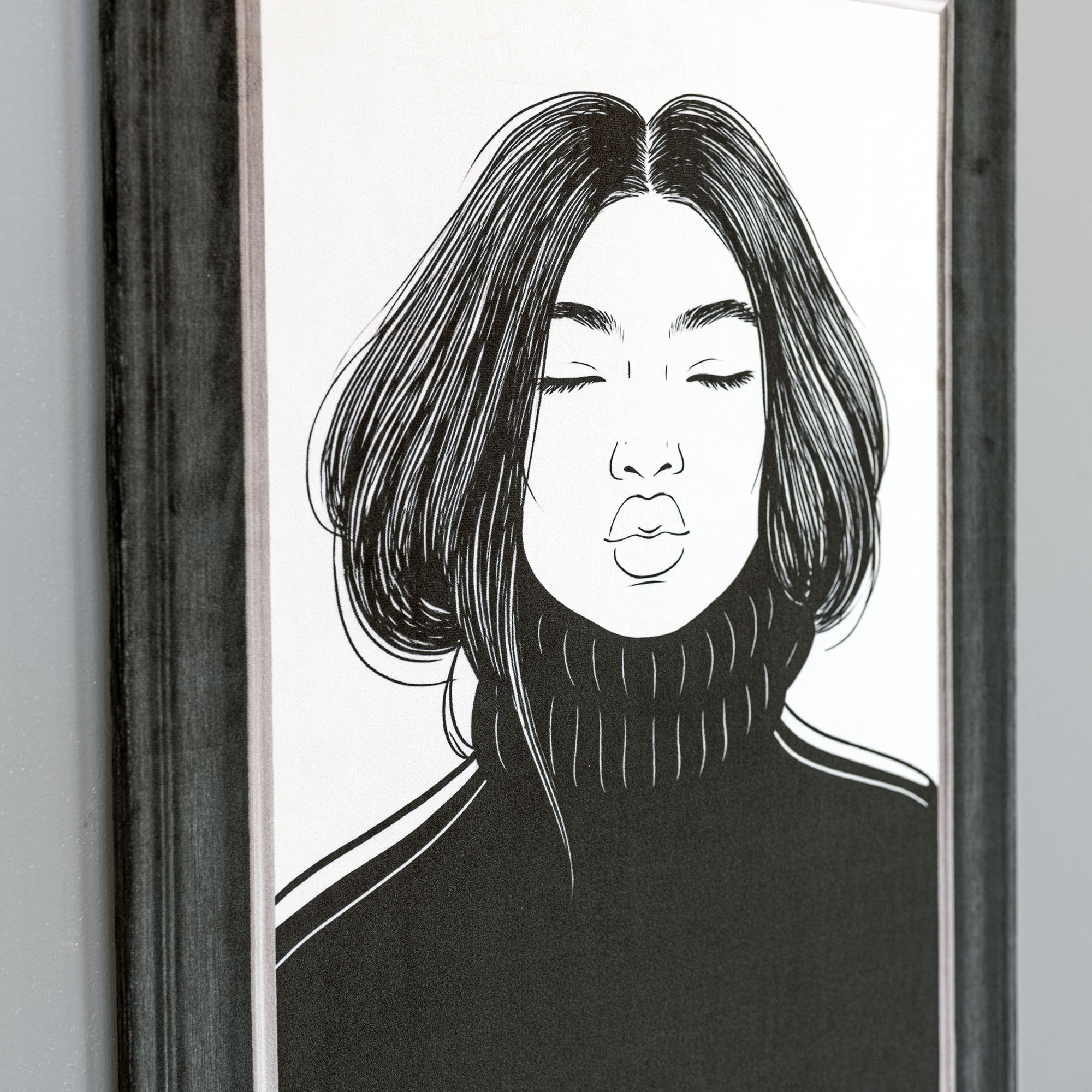 The printed velvet frame makes the artwork look as though it is surrounded by a solid dark grey wooden frame, producing a strong three-dimensional effect.