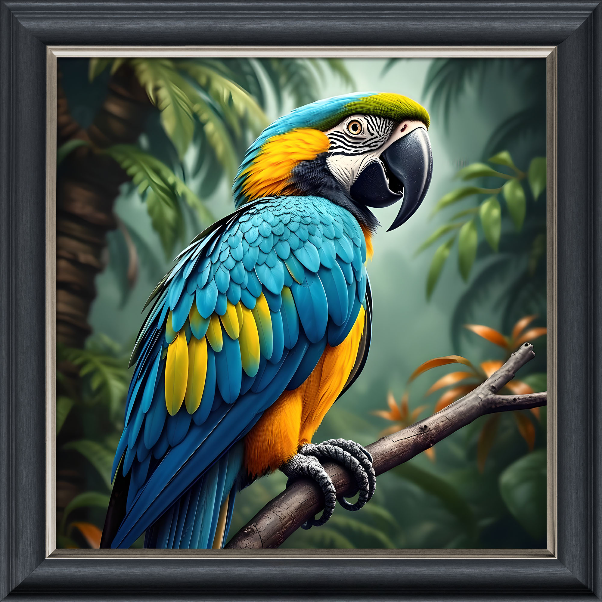 The Blue Parrot illusion artwork, crafted using high-quality French velvet, where the frame is cleverly printed as part of the artwork
