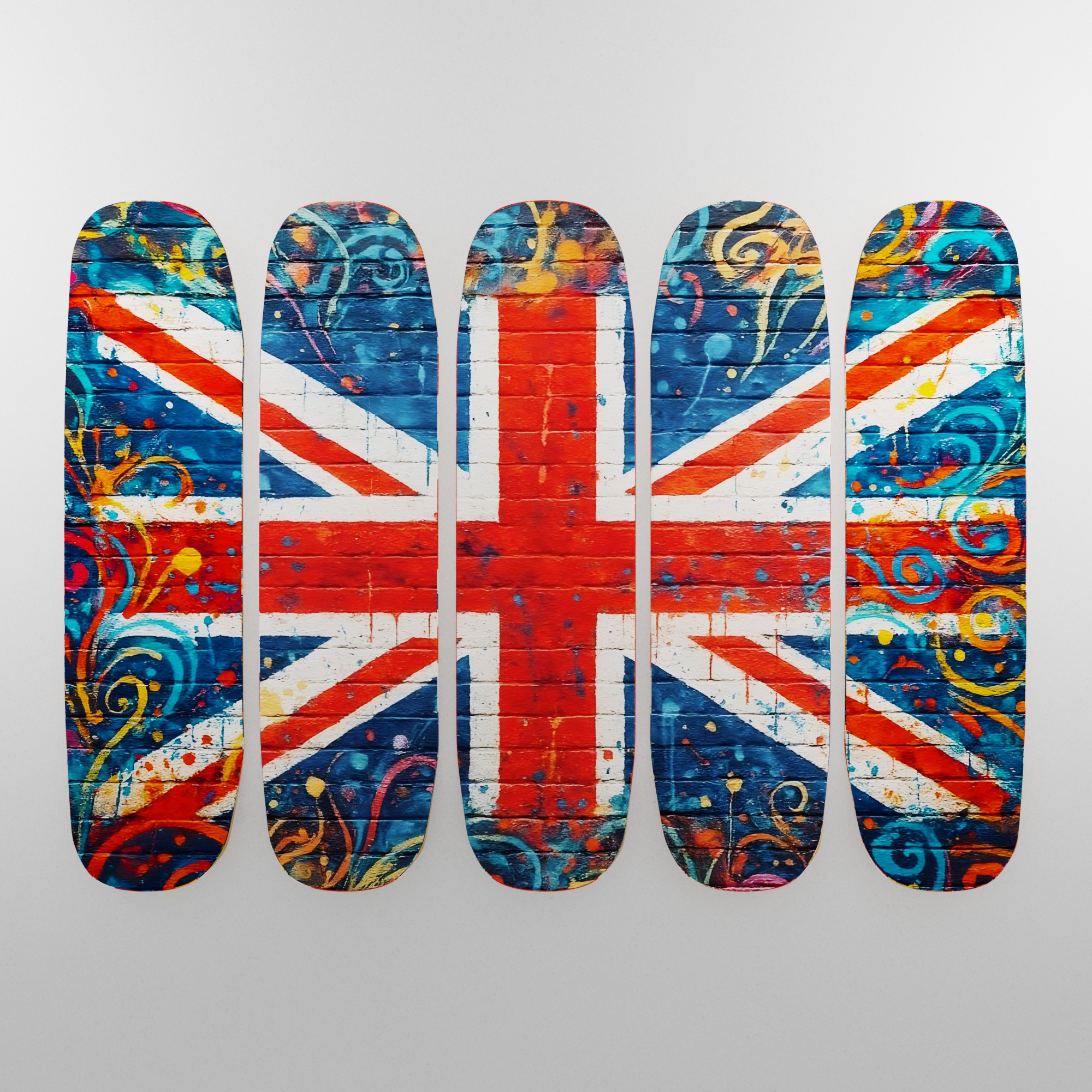 A set of five Velvet Fabric Skateboard Decks with a matching design, a standout set from Febland’s Velvet Artwork Collection that seamlessly blends contemporary style with street-art flair.